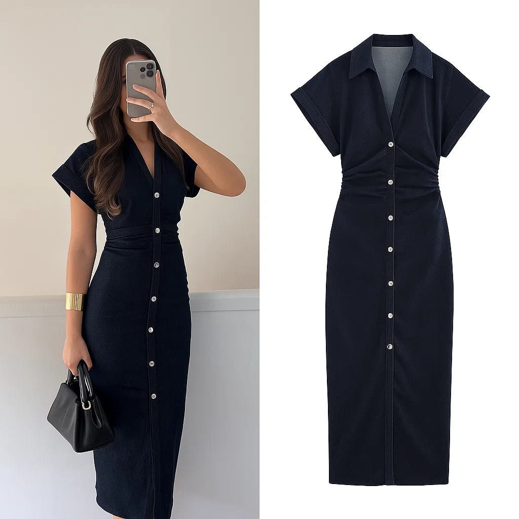 traf Spring New 1975 series denim MIDI dress with lapel side zipper fashion wrinkle waist slim elegant dress