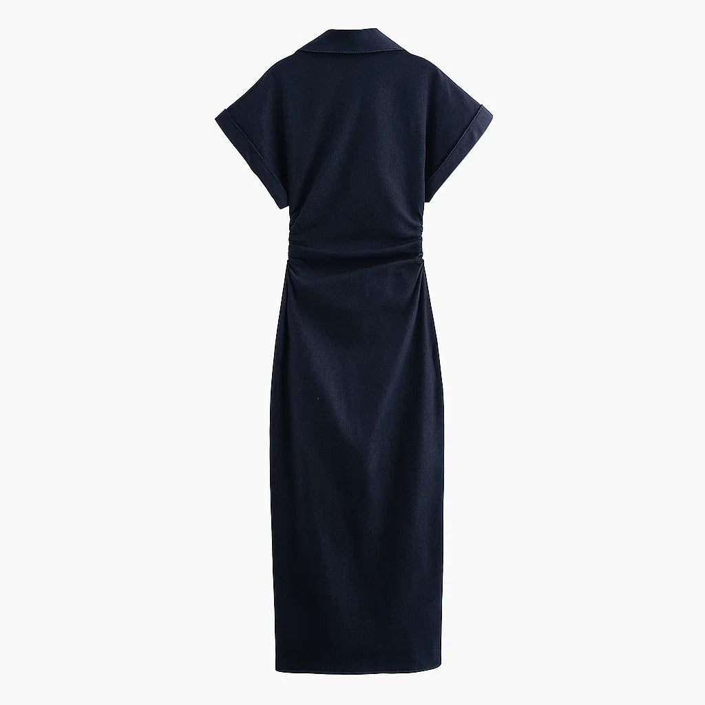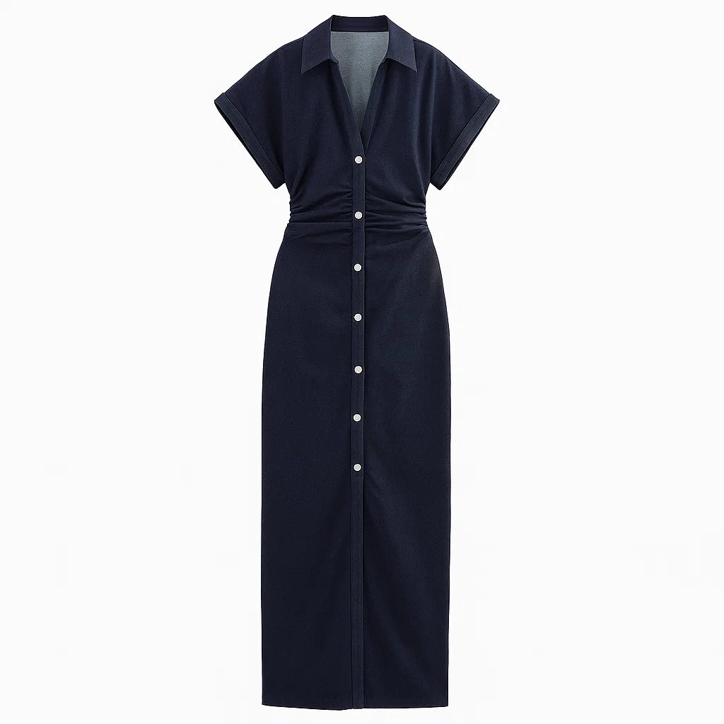 Midi DressDenim DressLapel Side ZipperFashion DressWrinkle WaistSlim Elegant Dress