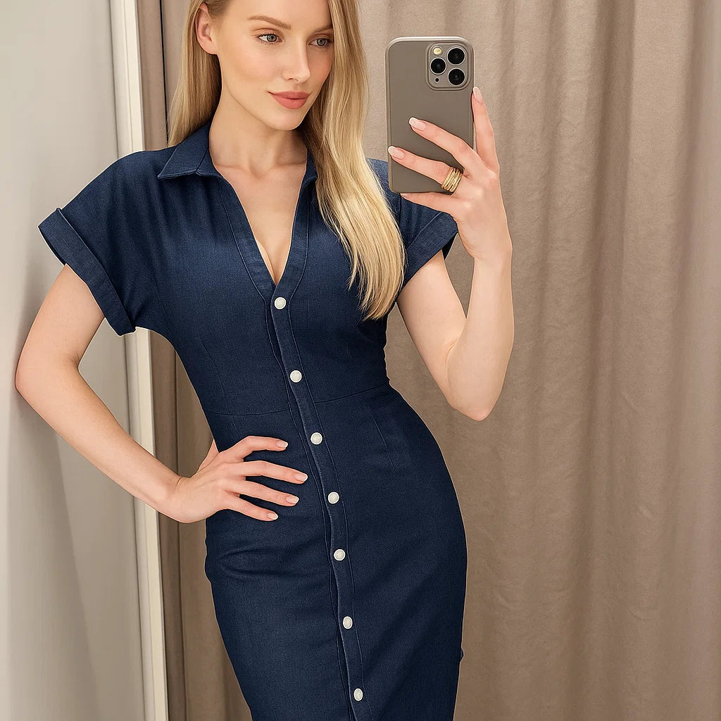 Crafted with high-quality denim, this dress offers a timeless and elegant look suitable for various occasions.