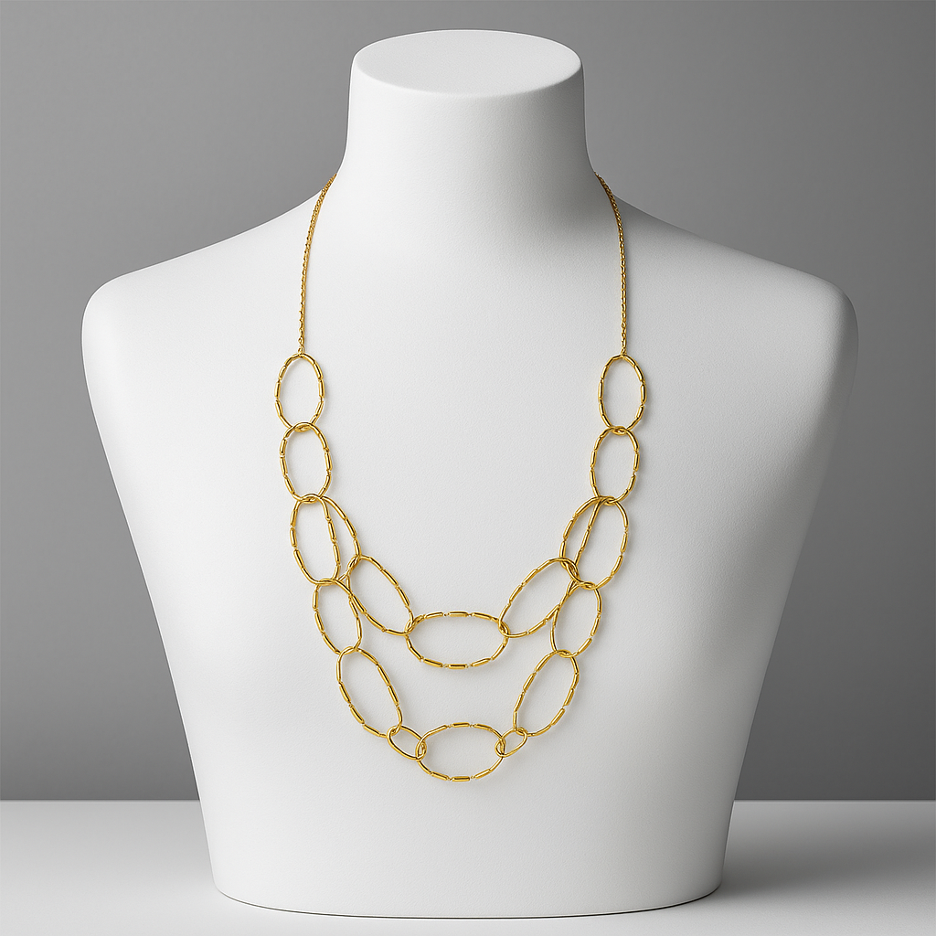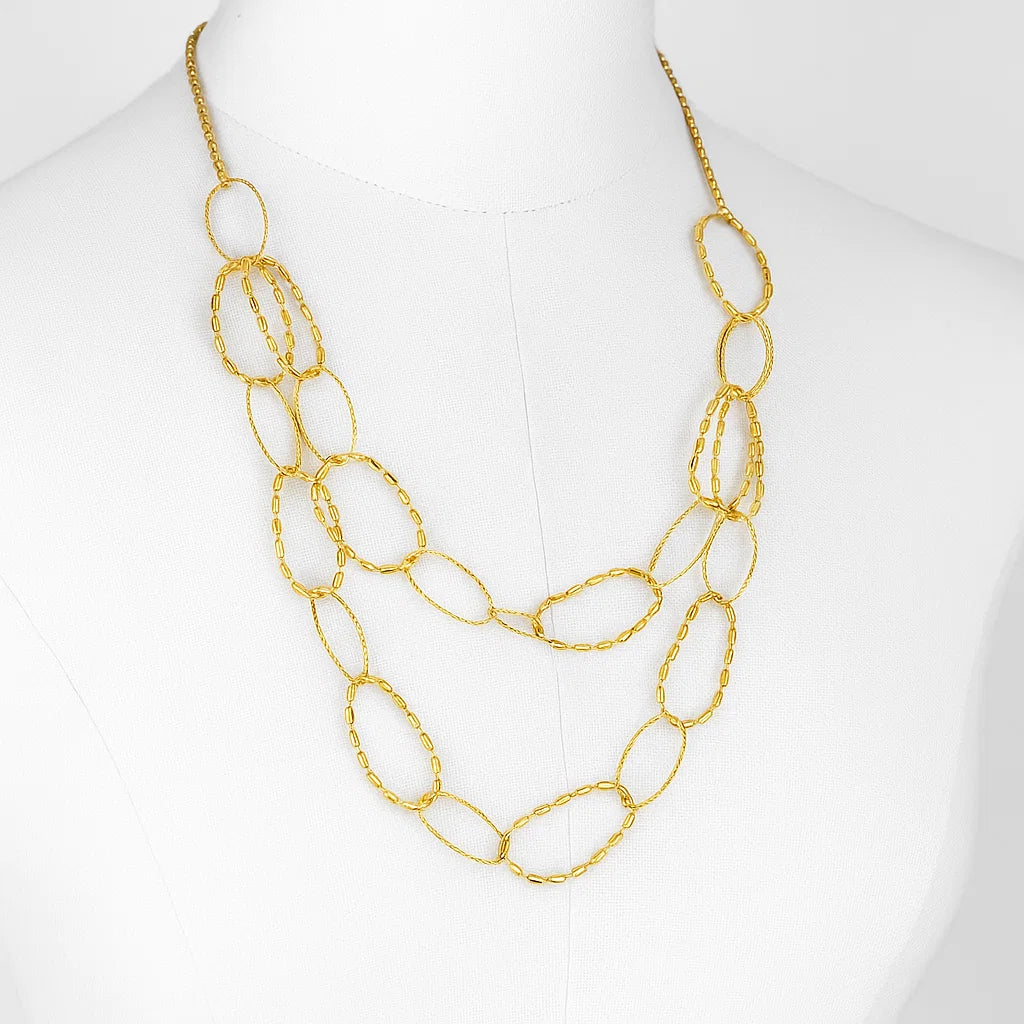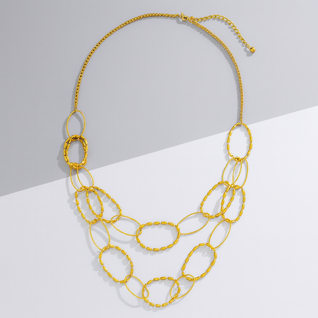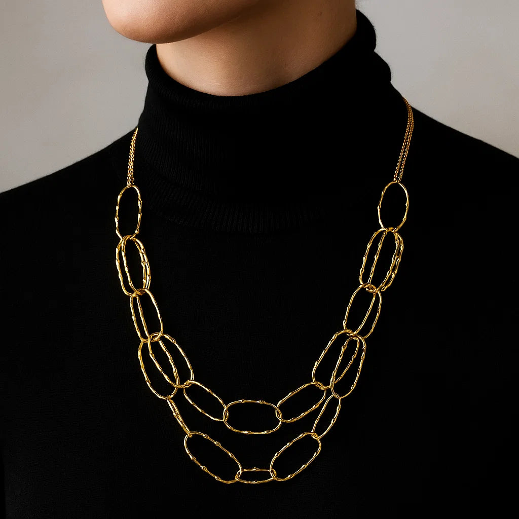 The Yhpup Stainless Steel Circle Link Double Layer Chain Golden Necklace exudes elegance and style, making it a versatile accessory for any occasion.